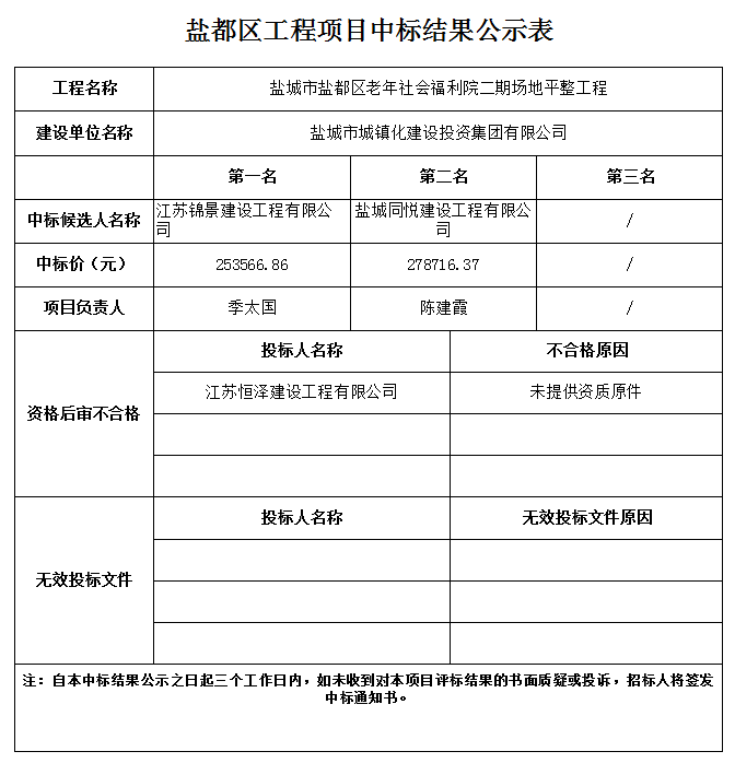 盐城市盐都区老年社会福利院二期场地平整工程中标结果公示