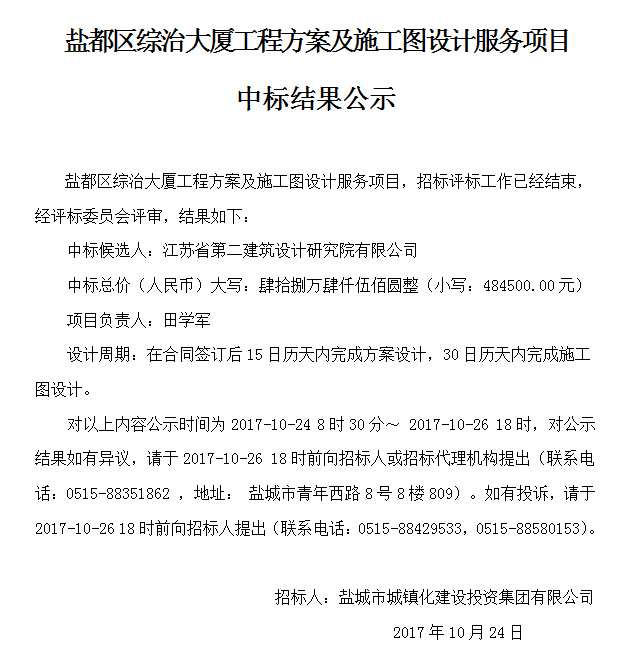 盐都区综治大厦工程方案及施工图设计服务项目中标结果公示