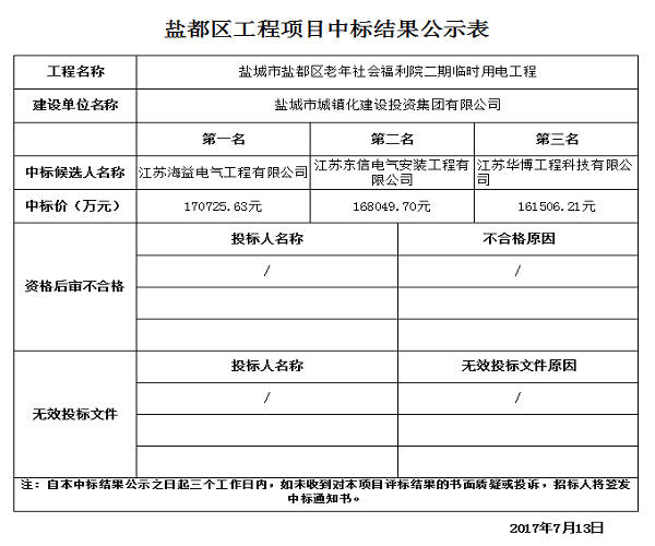 盐城市盐都区老年社会福利院二期临时用电工程中标结果公示