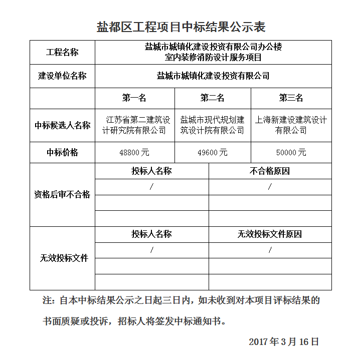 盐城市城镇化建设投资有限公司办公楼室内装修消防设计服务项目中标结果公示表