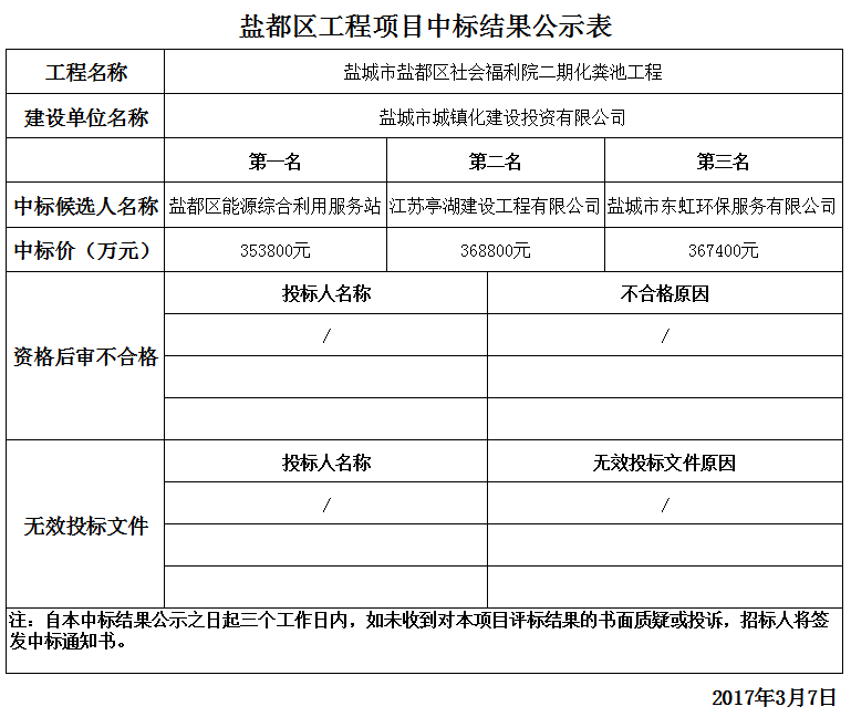 盐城市盐都区社会福利院二期化粪池工程中标结果公示表