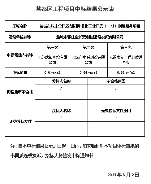 盐城市张庄全民双创园标准化工业厂房(一期)测绘服务项目中标公示
