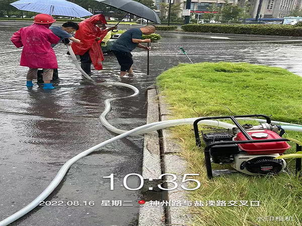 上午10点,经路面作业现场工作人员报告,在神州路与盐渎路交界处,最深积水达到15CM以上。应急小分队接到指令后,迅速驾驶车辆,运载水泵、水管、铁锹等防汛物资,不到10分钟就迅速赶到现场。在公司负责人刘凤权、孙荣才等人的现场指挥下,抢险人员立即查找造成堵塞积水的原因。经过查找发现,原来积水处只有一个下水道,无法快速排水。刘凤权当机立断,指挥抢险人员立即撬开附近窨井盖,把水管放进窨井,发动水泵,往不远处的雨水井排水。这时雨越下越大,风越刮越猛,抢险队员们冒着狂风暴雨,不畏雷鸣电闪,齐心协力清理积水,有的发动水泵梳理管道;有的用大扫帚清扫路面积水;有的清理积水中的垃圾杂物……队员各司其职,分工合作,在时间紧迫、环境恶劣的情况下尽力完成排水作业,经过紧急抢排,道路恢复了通畅。