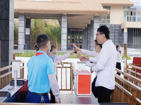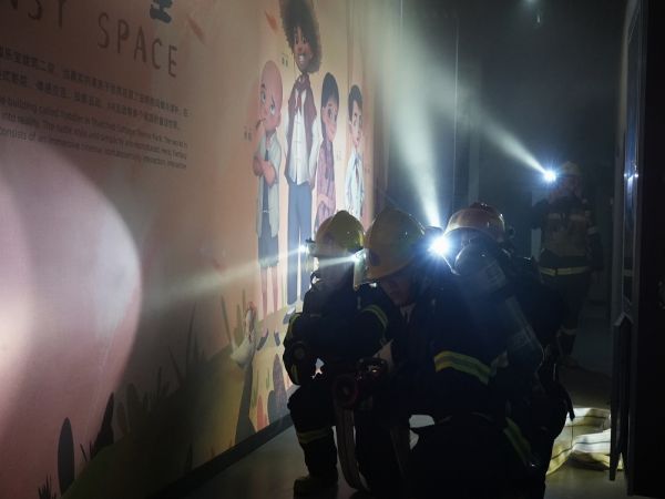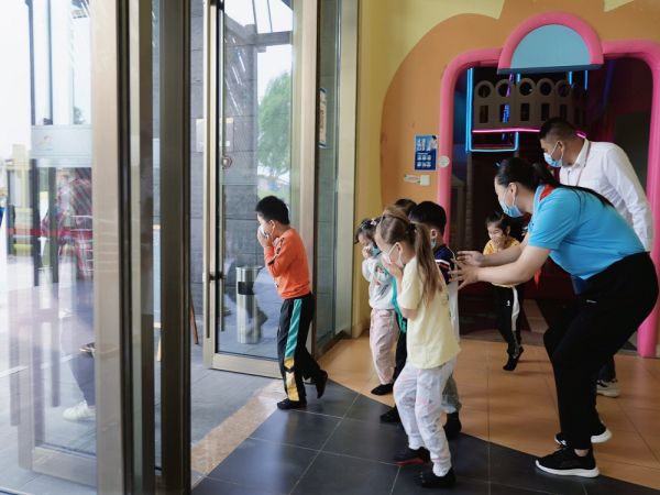 演练包括疫情防控专项演练、消防安全专项演练,以及游客突发事故应急救援演练三部分。消防安全专项演练模拟淘气堡发生火情的应急处置情况。疫情防控专项演练模拟游客入园未扫场所码和未佩戴口罩入园等应急处置情况。游客突发事故应急救援演练模拟观光车刹车失灵和游客从高处坠下等应急救援工作。
