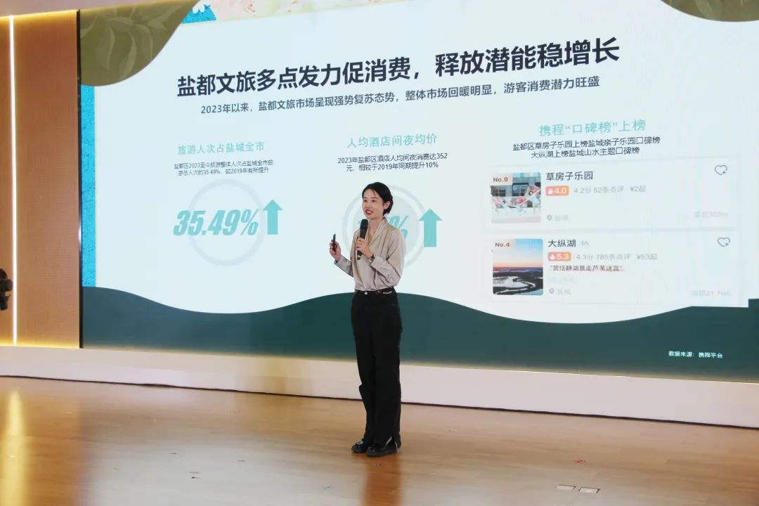 在推介会上,携程集团政府合作部项目总监王焱发布“盐都文旅及携程集团2023年战略合作”重点内容,深度剖析双方未来合作的蓝图。她提到,2023年以来,盐都文旅市场呈现强势复苏态势,整体市场回暖明显。携程一直都是盐城文旅发展道路上坚实的合作伙伴。去年双方共同打造的“到盐城·嗨周末”品牌获评文旅部2022年旅游宣传推广优秀案例。而今年,携程将继续深耕盐城文旅,在全市文旅资源的加持之下,依托2023年携程集团振兴A计划开拓区县合作,与盐都文旅建立战略合作关系,协同并进共育花开。携程集团将聚合站内外流量资源,从产品、营销、消费三大层面开足马力驱动文旅建设加速度,“串珠成链”,多措并举推动盐都文旅造就高质量发展格局。