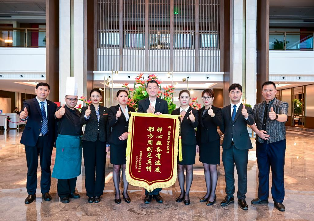 龙冈初级中学、鞍湖实验学校特地送来了一面绣着“驿心服务有温度 都方周到见真情”的锦旗,表达对酒店服务的认可与感激。酒店总经理封光雄在接受锦旗时表示,“我们深感荣幸能够成为学子们追梦路上的助力者。这面锦旗不仅是对我们工作的认可,更是激励我们不断前进的动力。我们将继续秉承‘驿心服务’的理念,为每一位宾客提供更加周到的优质服务”。